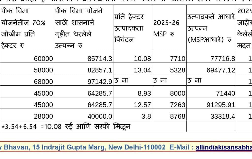 प्रेस नोटमध्ये सांगण्यात आले की, पिकविमा कंपन्यांना मोठ्या प्रमाणावर सबसिडी मिळावी म्हणून 70% जोखीम स्तरावर हेक्टरी कापसाचे उत्पन्न ₹60,000 आणि सोयाबीनचे ₹55,000 धरले जाते.मात्र,भरपाईच्या वेळी शेतकऱ्यांचे नुकसान अवास्तवरीत्या कमी दाखवून केवळ ₹18,500 ची मदत जाहीर केली जाते. याशिवाय, प्रत्यक्षात मदत देताना पुन्हा 50% नुकसान धरले जाते,त्यामुळे पूरग्रस्त शेतकरी अजूनच अडचणीत येतात.